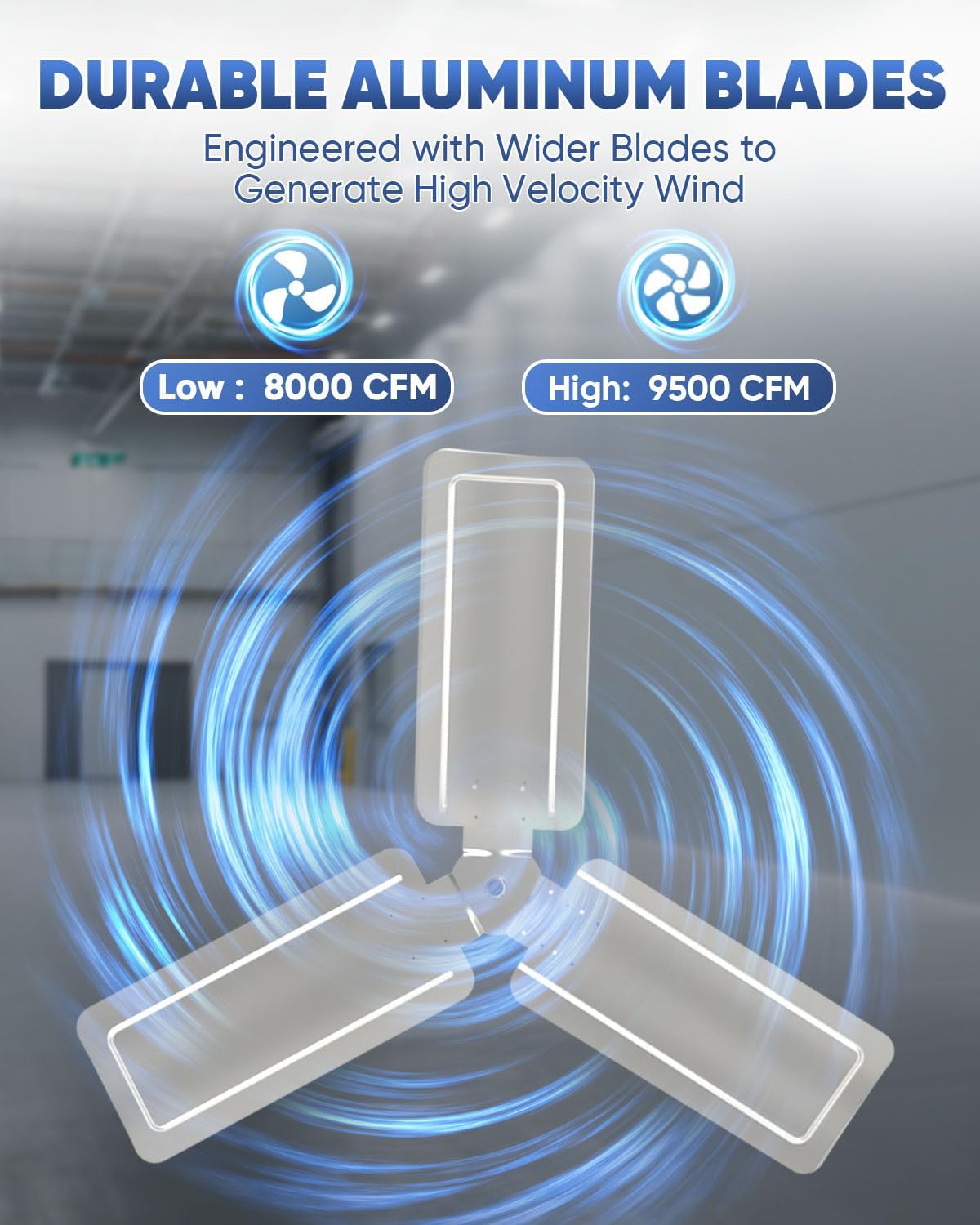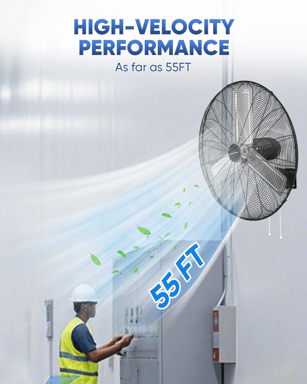 - Superior Airflow Performance. This high-velocity fan delivers up to 7497 CFM on high speed with 2-speed settings. Featuring 90Β° oscillation and 60Β° vertical tilt, it ensures efficient cooling and wide air circulation for large spaces.