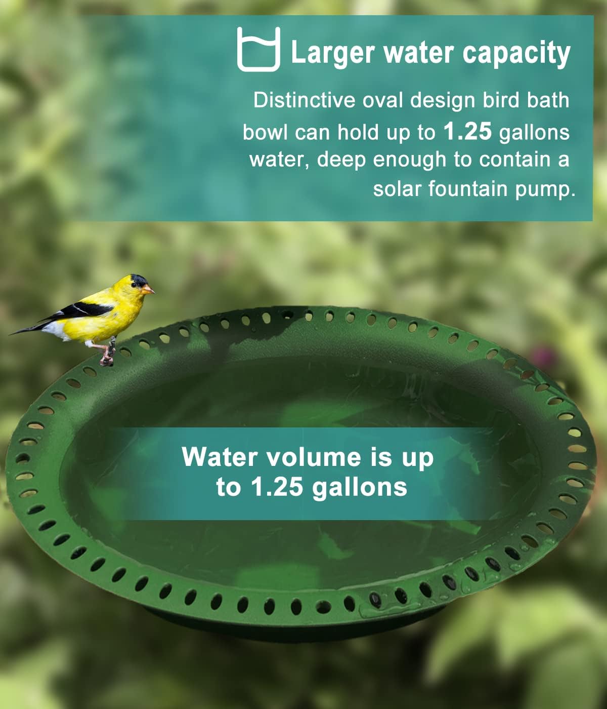 - More capacity & Oblong shape: This extra-large bird bath has an OBLONG tray with small holes along the edges, providing a stable standing and resting environment for the lovely bird friends. Bird friendly color--Green color basin is gentle and unobtrusive in your outside areas, and deep enough for contain a solar fountain pump. (Bowl dimension: 17.2β L Γ 13.2β W, bowl depth: 2.76 inches.)