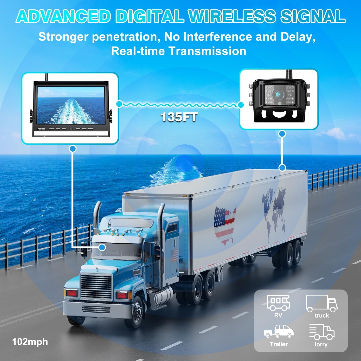 - ăAdvanced Digital Wireless SignalăThe system with stable digital signal works flawlessly within 128ft range in open area, enough for any large vehicles. Even at the high speed of 102mph, the monitor will display the surroundings in real time, making your driving more convenient. There is no interference, flicker, blurring or delay.