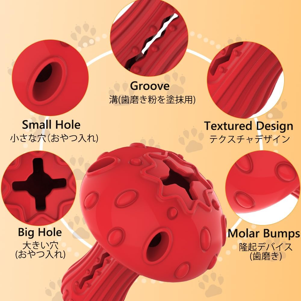 - Teeth Cleaning Toy: There are ridges and bumps on the surface of the mushroom doggy toy and a groove in the stem where you can insert jerky or apply dog toothpaste or peanut butter. It attracts dogsβ interest and helps them clean teeth while teething.