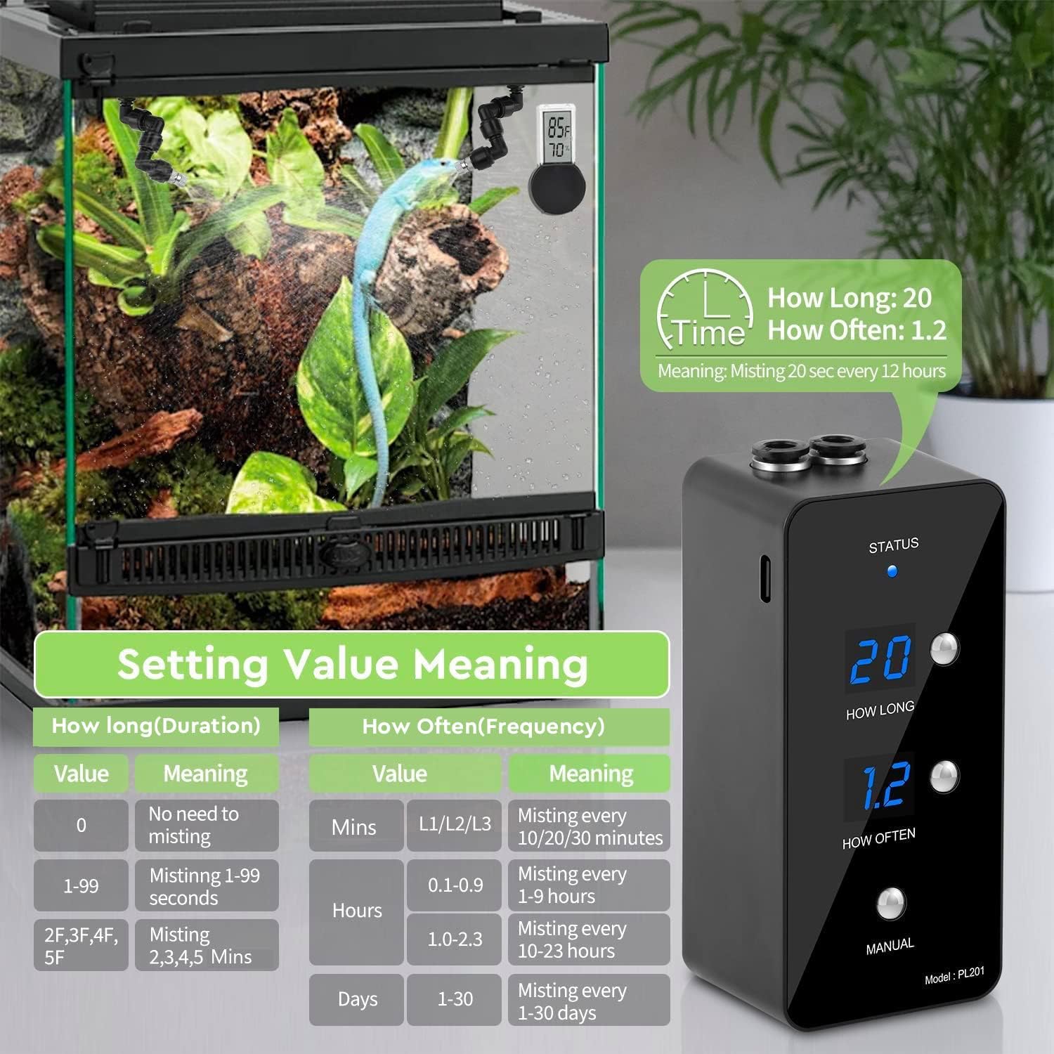 - High-Density Misting Effect & 360Β° Rotation Nozzles: Compared to the traditional reptile fogger, the misting system increases humidity effectively and rapidly. By rotating the 2 misting nozzles, you can make the misting cover every corner of your reptile terrariums.