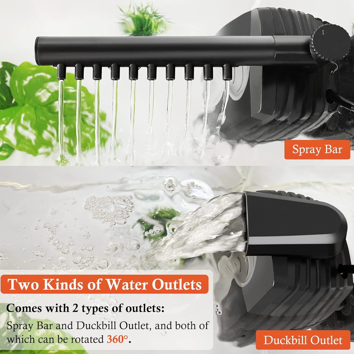 - 【Two Types of Water Outlets】The fish tank internal filter has two types of outlets: Spray Bar and Duckbill Outlet, and both of which can be rotated 360°. There is an adjustable knob in the spray bar, which can adjust the water flow of the filter, and the adjustment range is 0-165GPH.