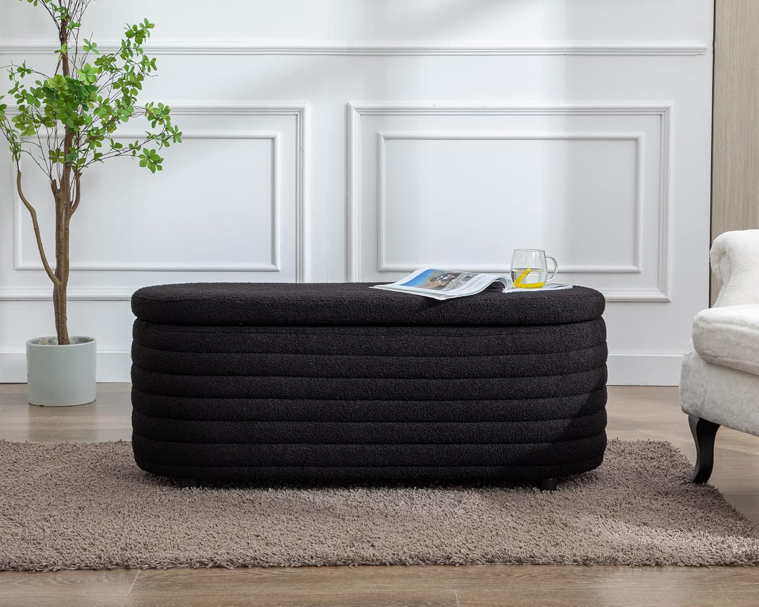Storage Ottoman Bench Upholstered Fabric Storage Bench End of Bed Stool with Safety Hinge for Bedroom, Living Room, Entryway (45.5-inch, Black)