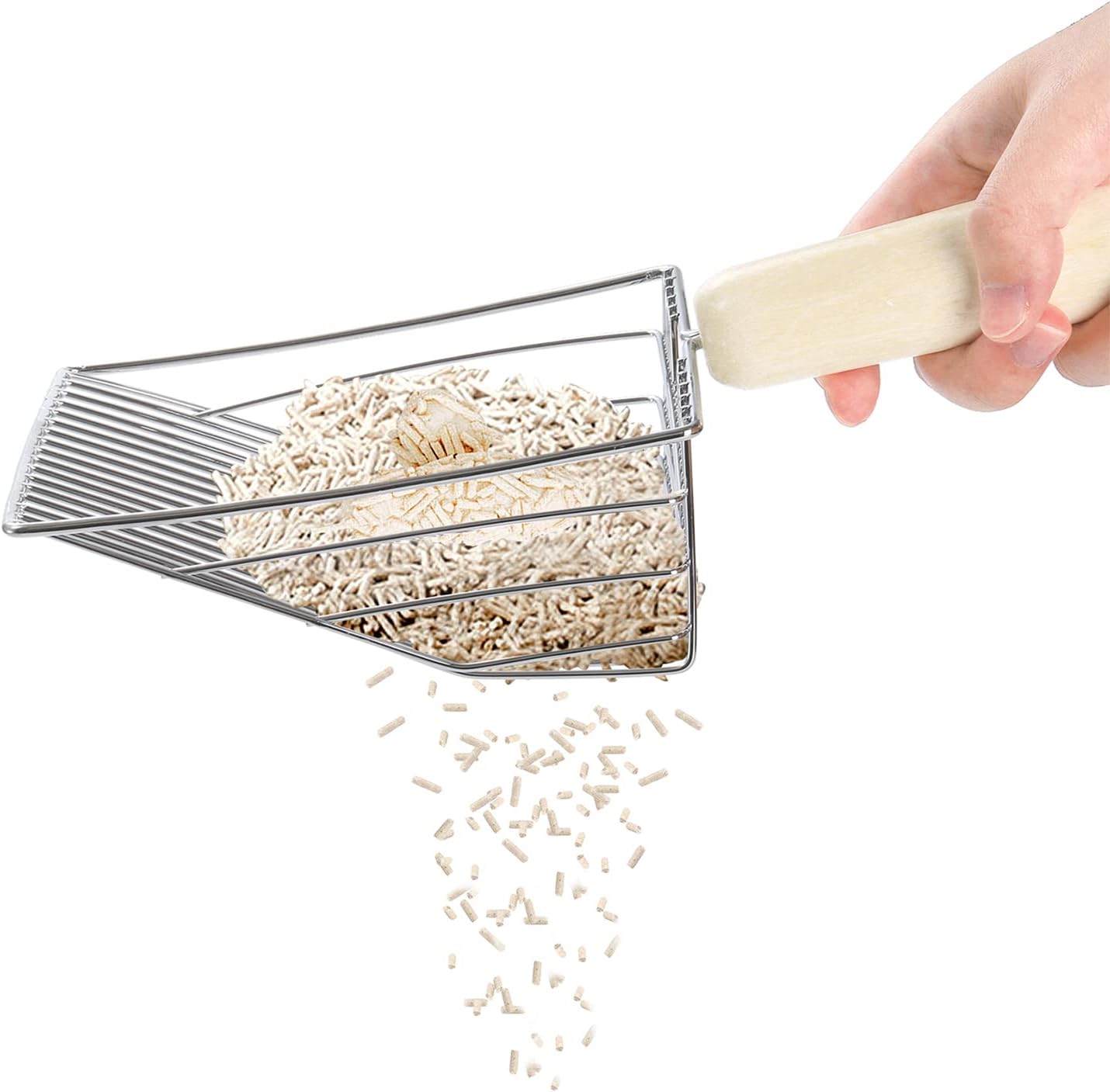 - DURABLE MATERIAL - Our kitty litter scooper is made of high-quality metal that are built to last. The metal construction ensures that it won't rust and can withstand all kinds of bumps. The base is made of selected ABS material, which is durable, wear-resistant, and not afraid of damage. And the solid wood handle adds a touch of warmth and comfort to the design.
