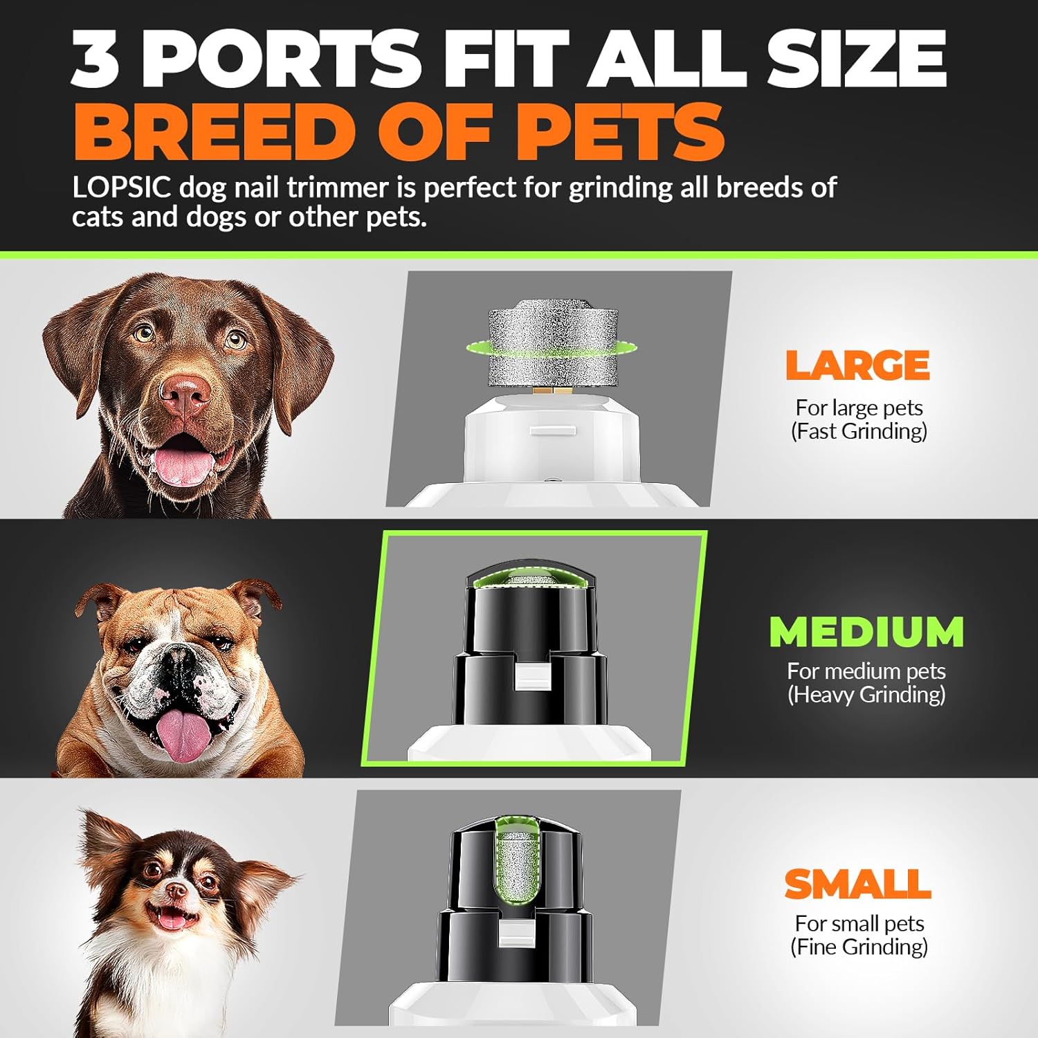 - 【3 Grinding Ports & Rechargeable】: LOPSIC dog nail grinder has 3 grinding ports for grinding different sized pets’ nails, suitable for all types of large,medium, small animal nail care and cat claw care. You can select an appropriate port to trim nails of different thicknesses and lengths. The dog nail trimmers are specially designed rechargeable devices, making it convenient to charge and use this dog nail grinder for dogs anytime and anywhere