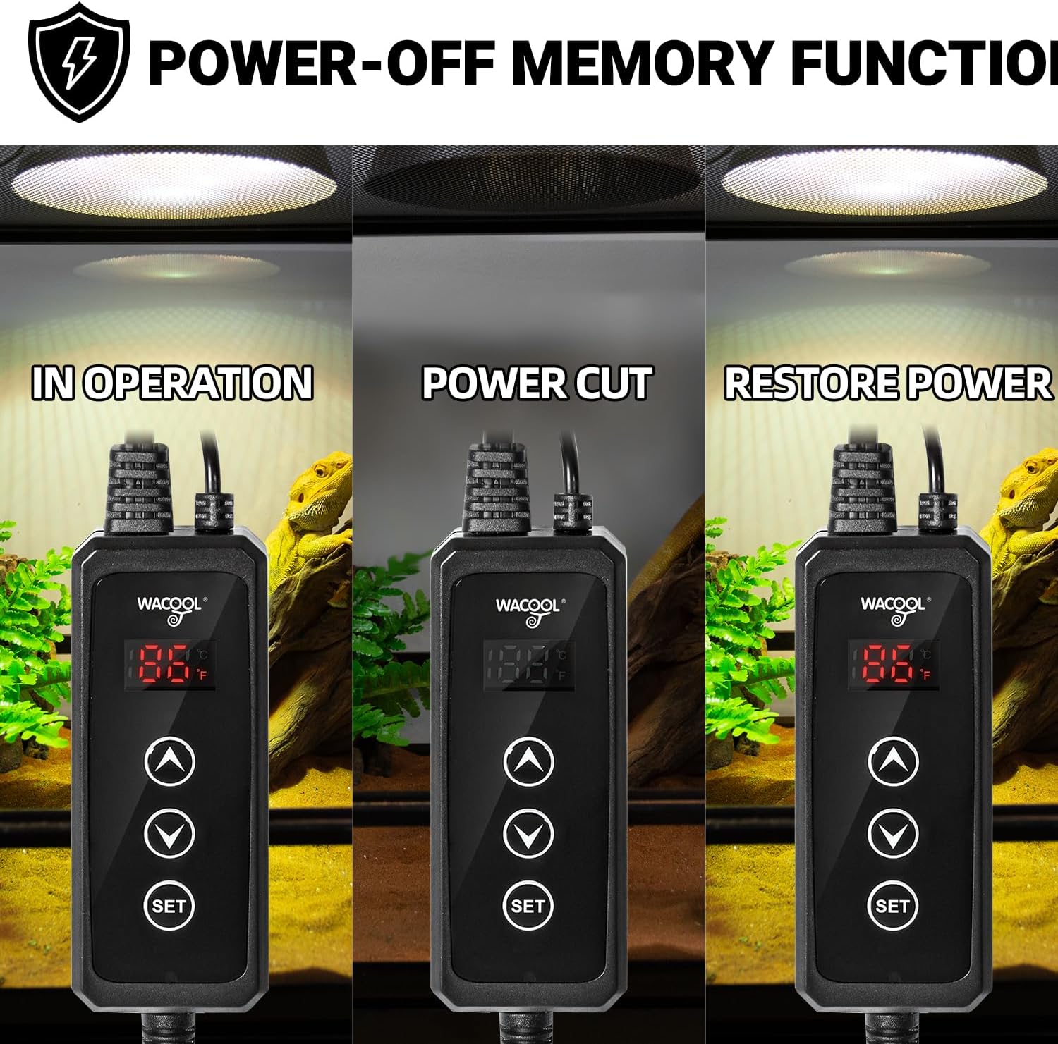 - Easy Operation Reptile Thermostat: Easy to operate and set up, this reptile thermostat ensures that the bulb operates within the set temperature range, and does not need to be reset after a power off, and works according to the last setting.