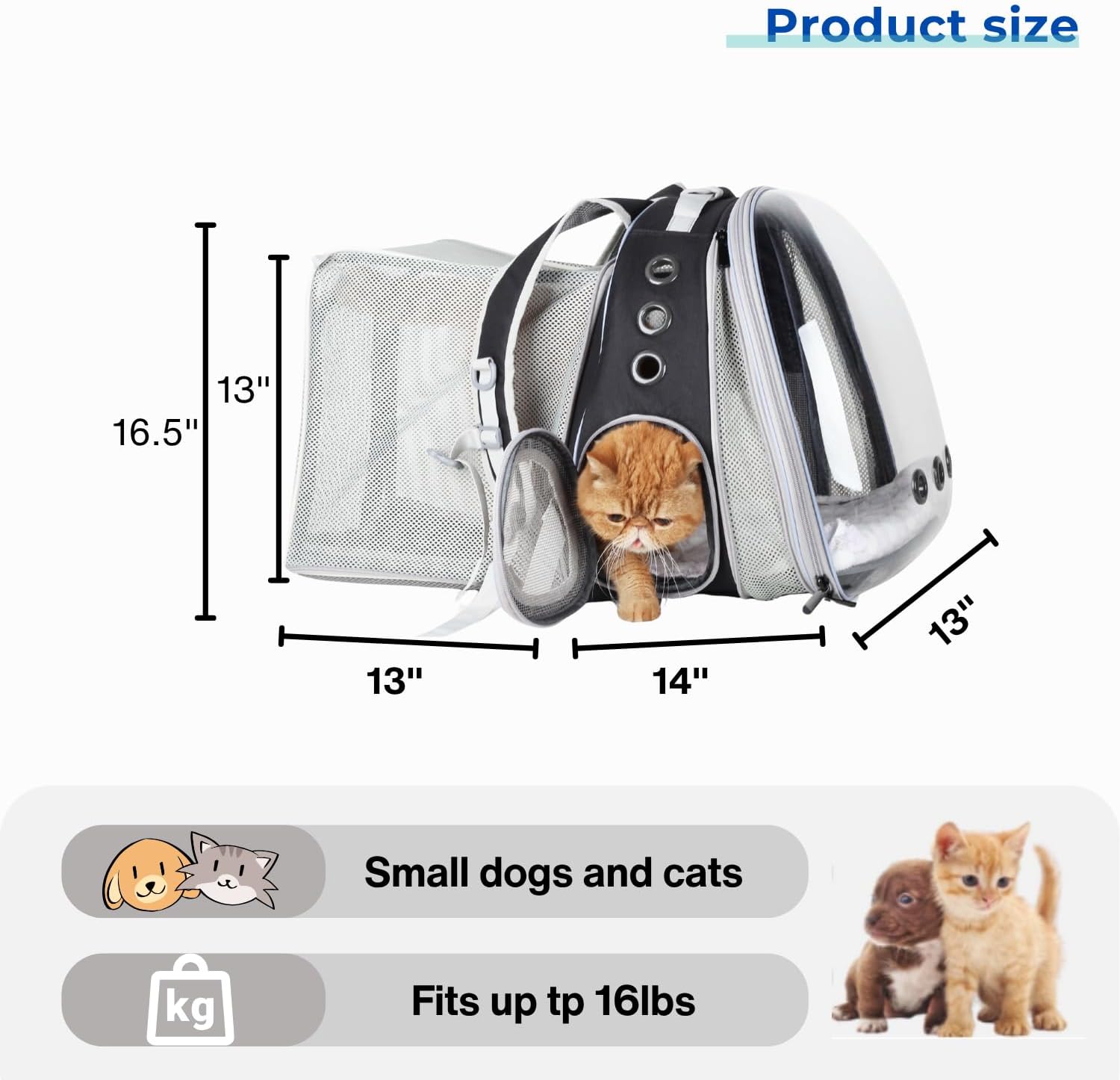 - Large expandable design: Measuring 13"L x 14"W x 16.5"H, Expandable part size is 13''L x 9.5''W x 13''H(square shaped)a larger cat backpack carrier in its class both in the backpack and the expanbable part; fits cats and medium dogs up to 16lbs; This backpack can be expanded in back and front panels; with more than twice the original capacity, this provides ample room to move around and reduces anxiety, creating a comfortable environment for your furry friend