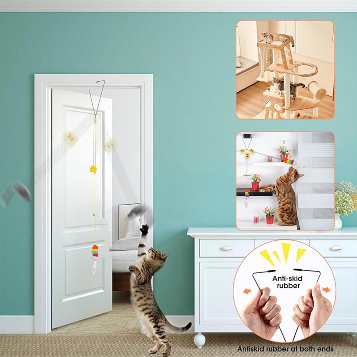 - Hanging Door Cat Toy: These indoor interactive cat toys can be hung on door frames, doors,glass window and so on, can be hung anywhere using stickers or Triangle Hook, whenever your cat touches the hanging kitty toys, the feather cat toys wand will move in a shaking way, the bells on the string will make a clanging sound to attract the cat's attention more, it allows the cat to get exercise and prevent obesity and boredom.
