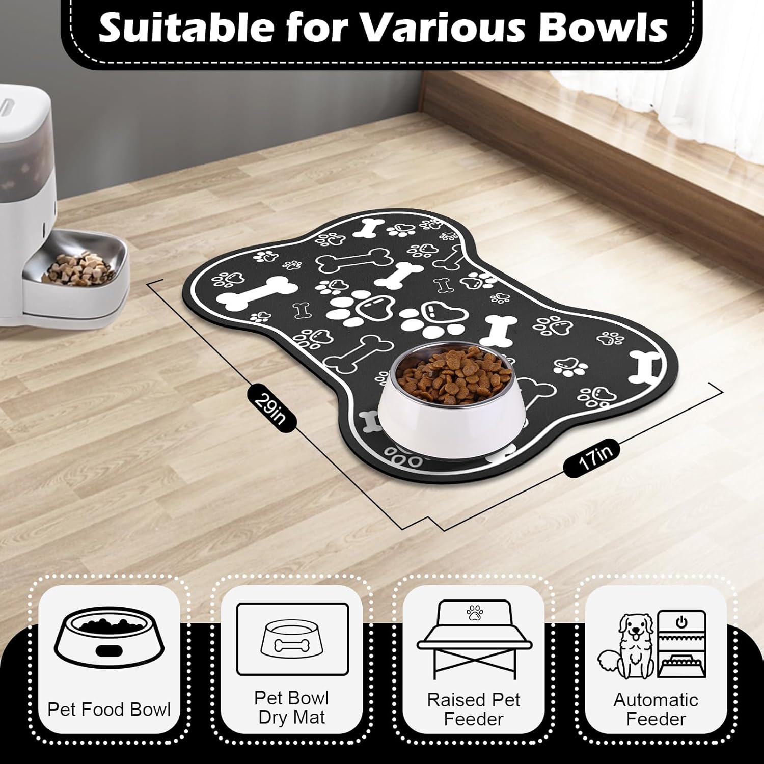 Dog Cat Food Mat,Rapid Absorbent Pet Feeding Mat, Bone Shaped Dog Placemat Water Bowl Mat with Rubber Backing,No Stains Dog Cat Food Mats Indoor, Pet Accessories Supplies 17"×29" Black