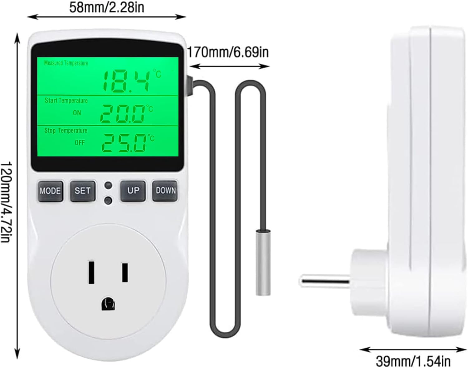 - TEMPERATURE CONTROL FUNCTION : Our thermostat plug allows you to set the start and stop temperature to control heating or cooling equipment with a range of -40℃~120℃ (-40℉~248℉). Timer thermostat support 15A/120V 1800W load. (start temperature > stop temperature, cooling; start temperature < stop temperature, heating). This thermostat plug also supports temperature calibration.