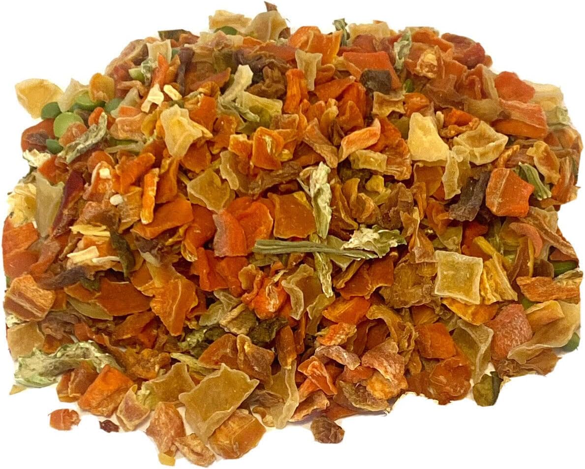 - Ingredients include spilt peas, carrots, potato, collard, green pepper, red pepper, sweet potato, kale, oyster calcium, limestone, calcium and shrimp
