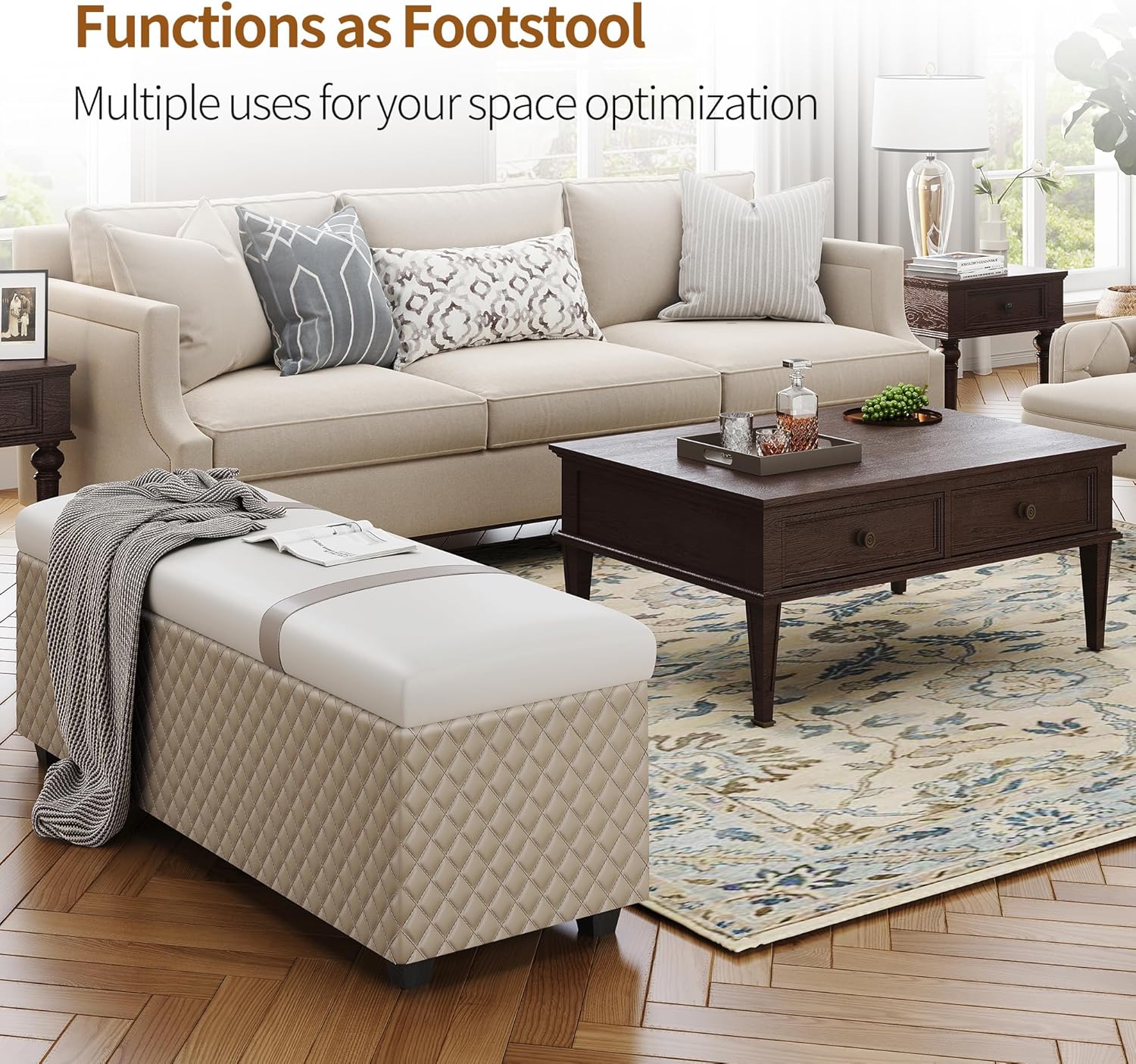 - γ Widely used γ This bench ottoman is usually put at the end of bed in bedroom,as a end bed bench, It can be used for sitting or for placing feet while lying in bed.The bed bench can also be used as a footstool, fashion seat, shoe stool, window bench, or pet bed. Light weight, but firm and comfy, it can be moved easily to living room, bedroom, office, fashion closet, kid's playroom, den, studio apartment.Color that is elegent and classic, it adds a visual interest in your room