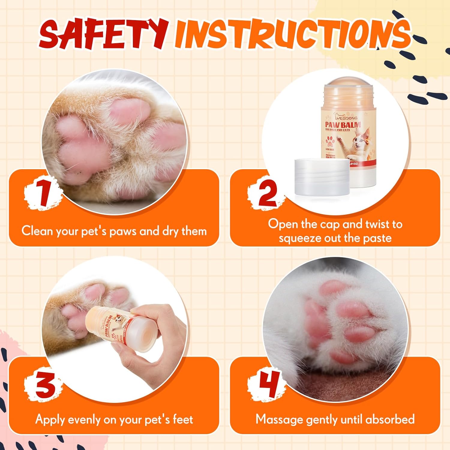 - Safe Ingredients: our cat and dog paw balm is made with natural ingredients such as olive oil, beeswax; It has passed MSDS testing; Avocado oil in moderation is generally safe for pets; Our formula is suitable for dogs and cats and does not contain any harmful or sensitive ingredients to ensure the safety of your pet; If you have any concerns, it is recommended that you consult a veterinarian before using it on your pet