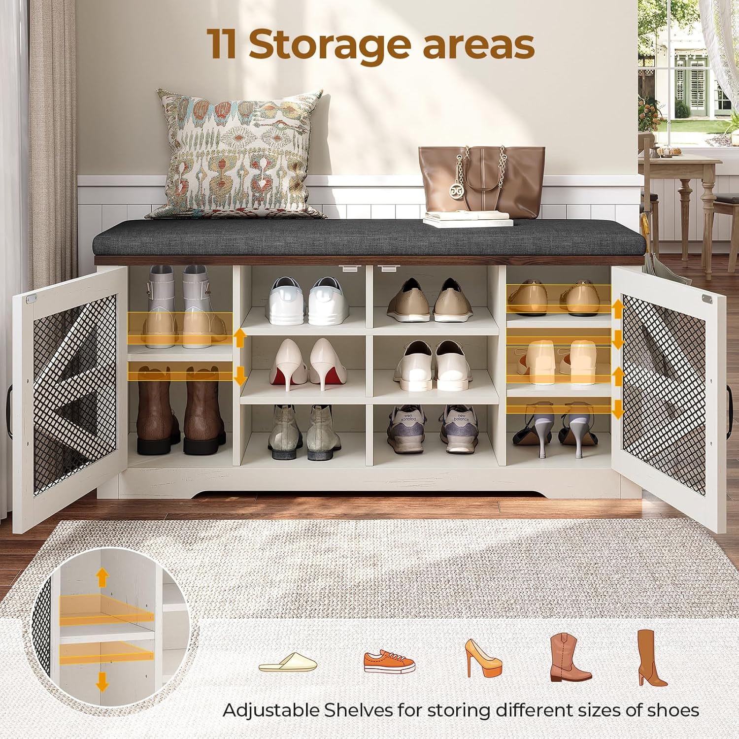 Farmhouse Storage Bench with Cushion, Metal and Wood Shoe Rack Organizer, Adjustable Shelf, Shoe Cabinet with Half Hidden Storage Space, for Entryway, Bedroom, Living Room (Old White, 43.3in)