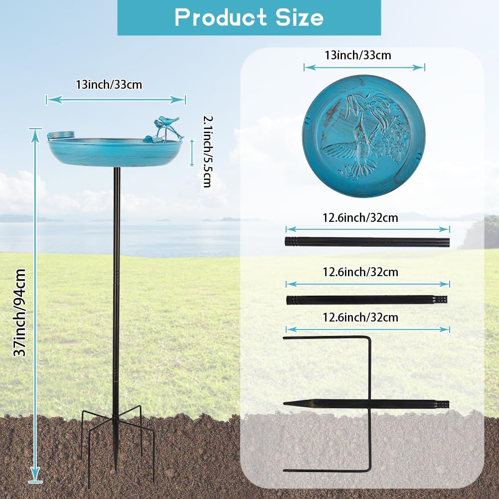 - Bird Bath Bowl: This blue bird bath measures 37 inches high X 13 inches diameter. Designed with hummingbird and flower patterns printed on the bowl bottom, and 2 metal birds standing on branches on the edge of the bird bath, making it easy to invite other birds to enjoy comfortable bathing time