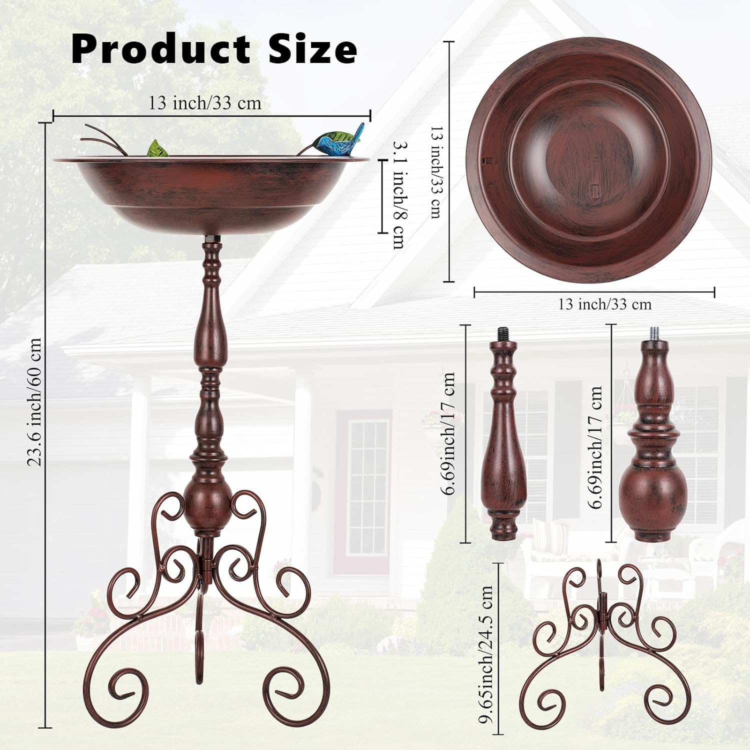 - Unique Design: The vintage copper bird bath measures 17" H, the diameter of the bird bath bowl is 13" and the depth is 2.8". There is a cute bird and leaves statue in the birdbath basin, which can attract more birds to stop and enjoy a good time together in in the bird baths