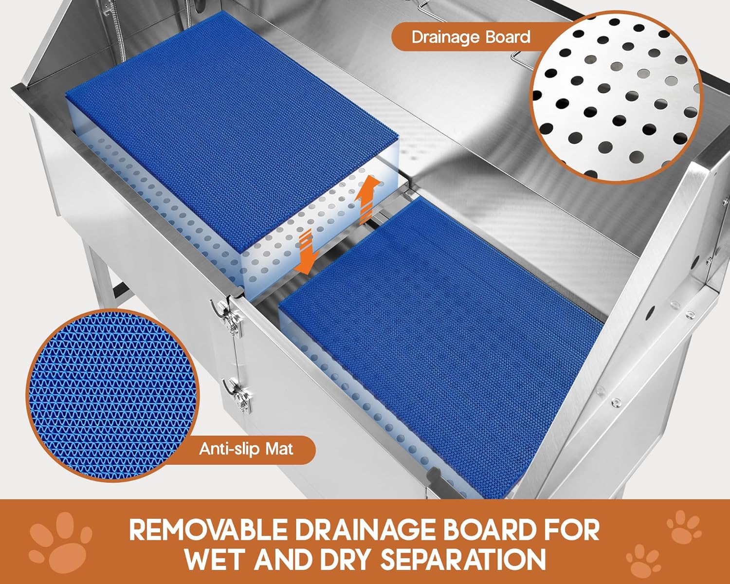- Removable Drainage Board: Height-adjustable, removable drainboard of pet bathtub accommodates pets of various sizes and supports up to 440 lbs. Also equipped with anti-slip pads.