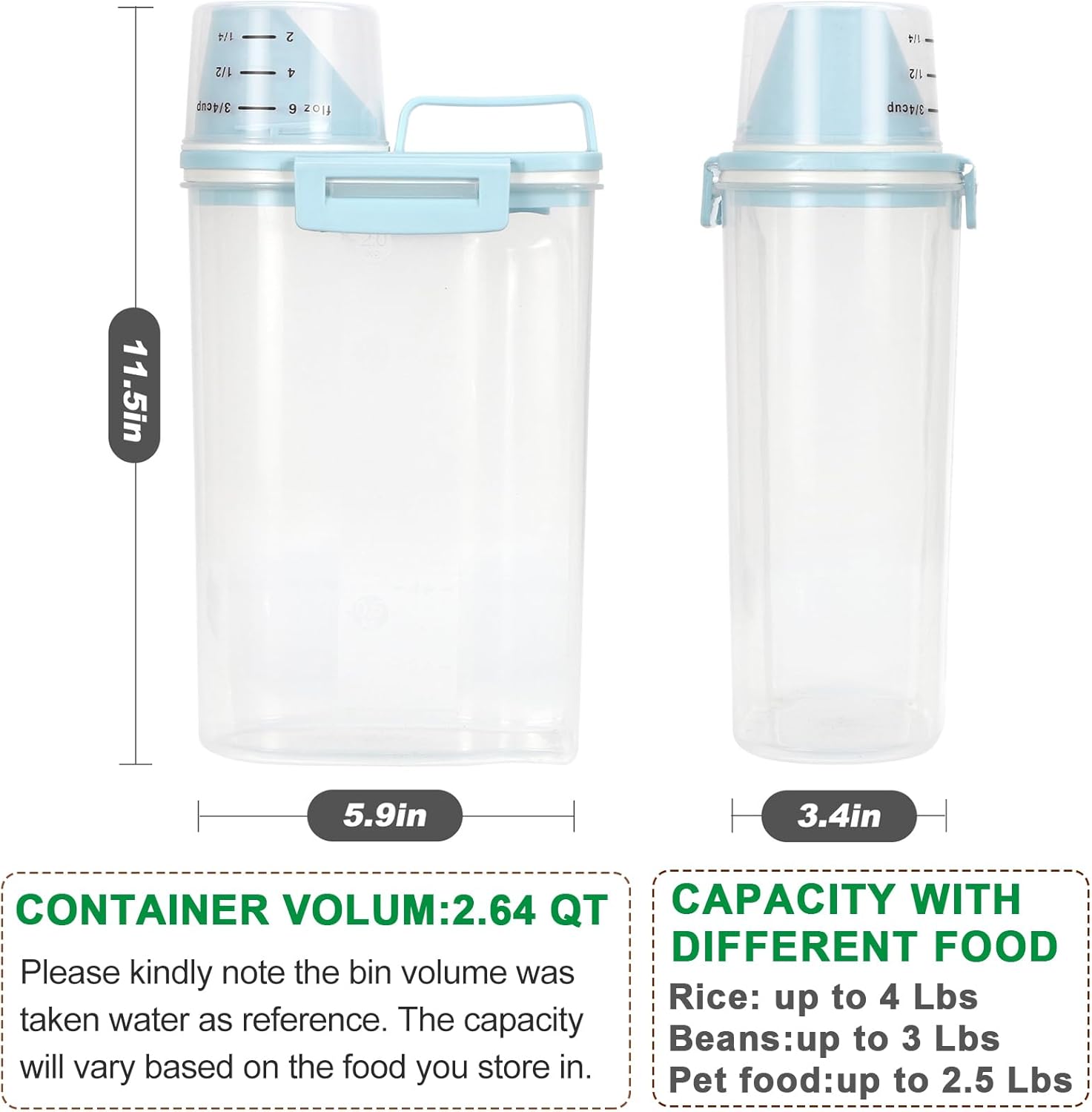 - Versatile Storage Container: The portable rice dispenser will fit your many storage need, from storing dry food to laundry detergent. The rice container normally can hold 4 lbs of rice and capacity will vary depending on different food