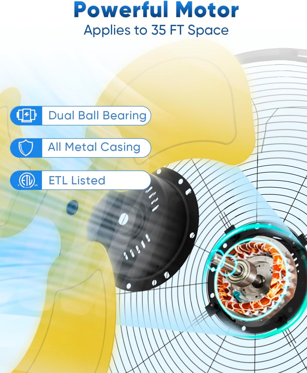 - Ultra-Durable Construction: Features an ETL certified, overload-protected ball-bearing motor, UL listed power cord, 3 blades aluminum fan, and OSHA compliant powder coated steel grille for years of rugged use.