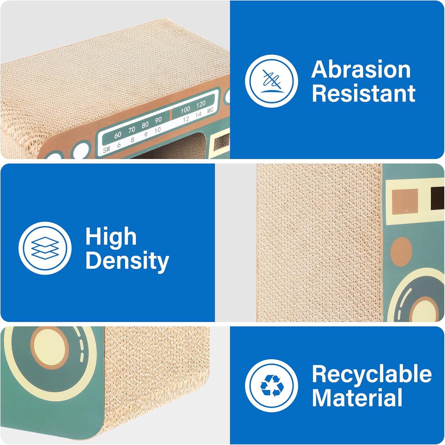 - Radio-shaped Cat Scratcher: Featuring a fun and aesthetically pleasing design, this scratcher offers various play and exercise surfaces, resembling a radio shape to entice cats with engaging scratching options and a visually appealing structure.