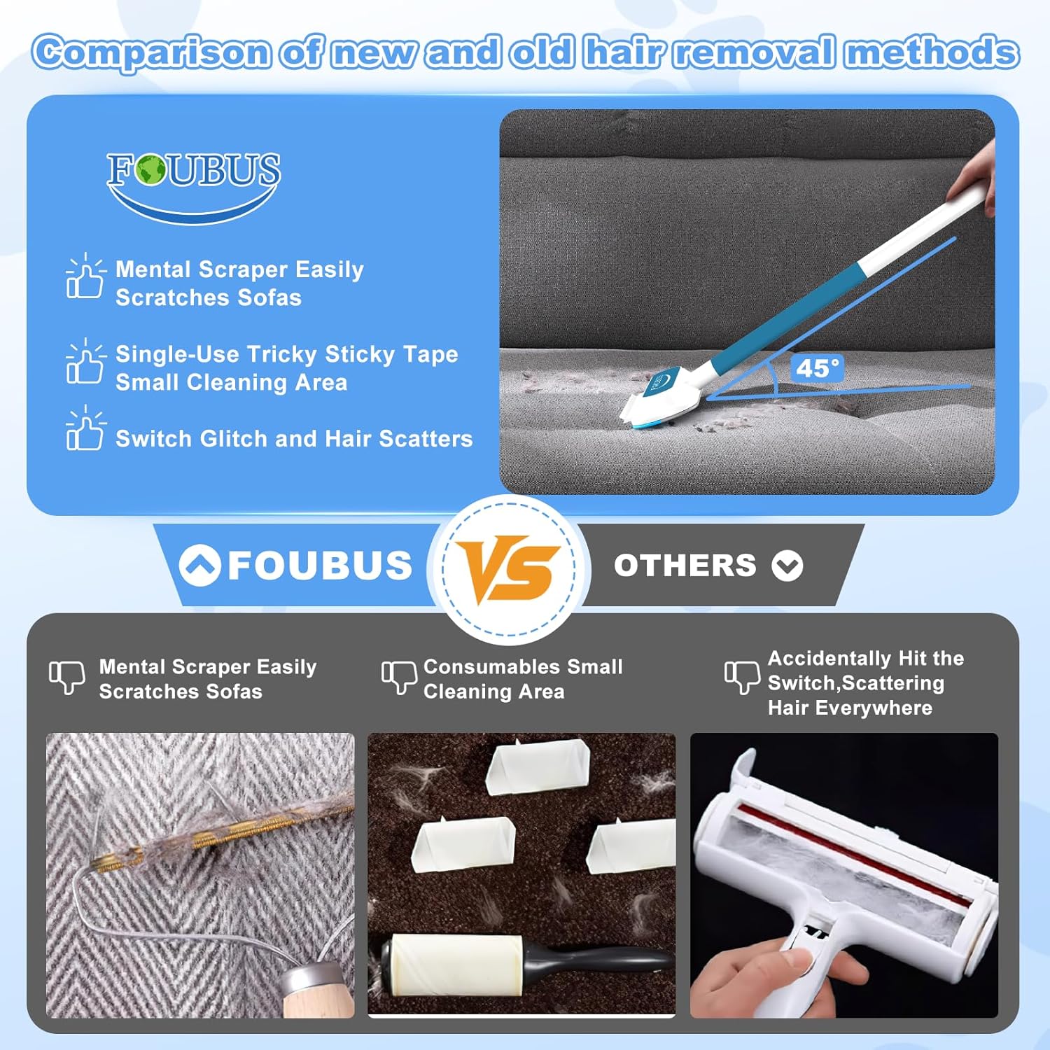 - 🐈Good For Your Pet's Body🐾Pets often lick household items that are similar in texture to fur which can cause your pet to vomit frequently. Whether it's dry debris or wet spills, FOUBUS animal hair remover handles it all. Unlike traditional sticky rollers & lint brush, FOUBUS pet fur remover leaves no traces of glue behind,regularly clean all areas of your home of dust and fur, ensuring a clean and safe environment for your pets and family. Say goodbye to metal strips scratching fabrics.