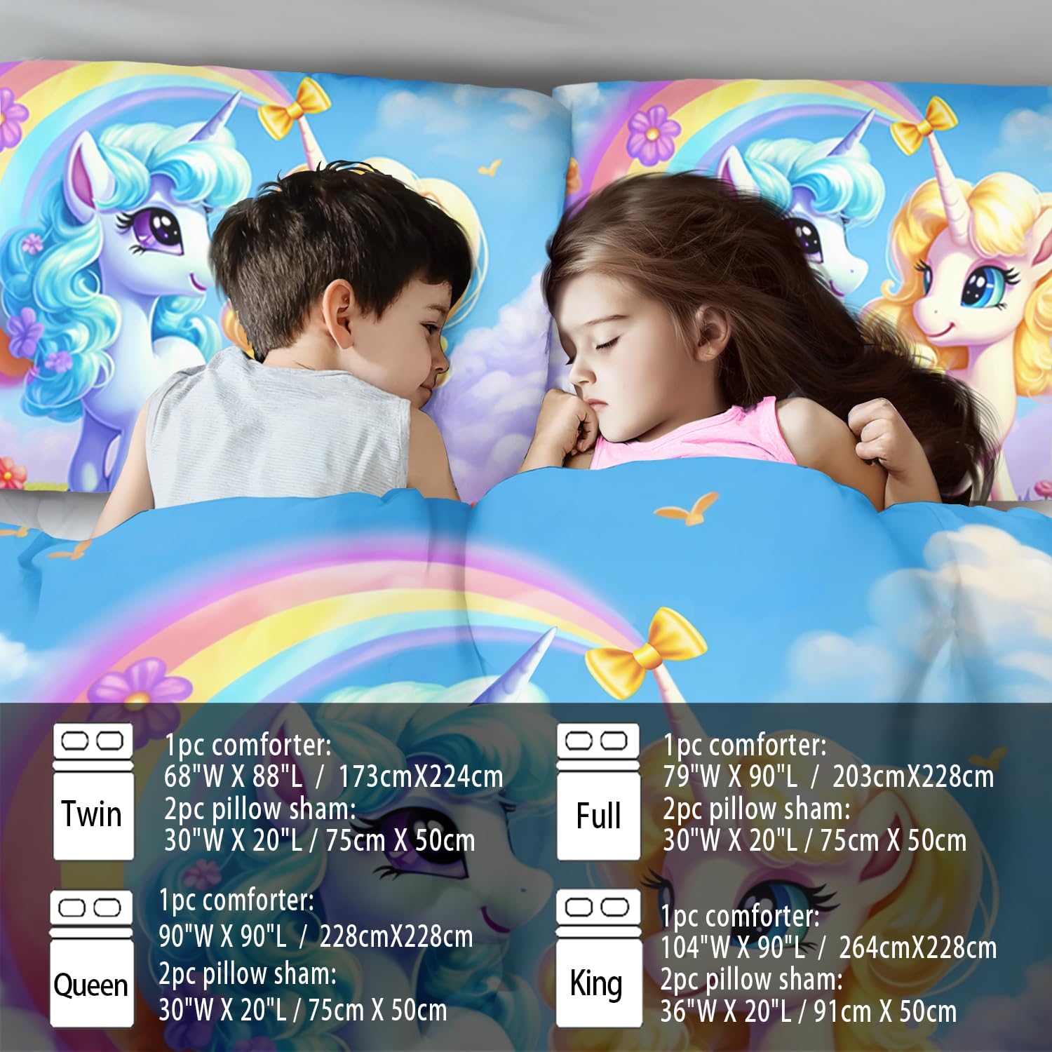 - Full Size Rainbow Unicorn Comforter Set :This bedding set includes 1 comforter(67" x 85") and 2 pillowcases(20”x30”). In order to facilitate transportation, the quilt is made of vacuum compression technology. It will be slightly wrinkled when taken apart, but it will quickly regain its fluffiness if you gently beat it.
