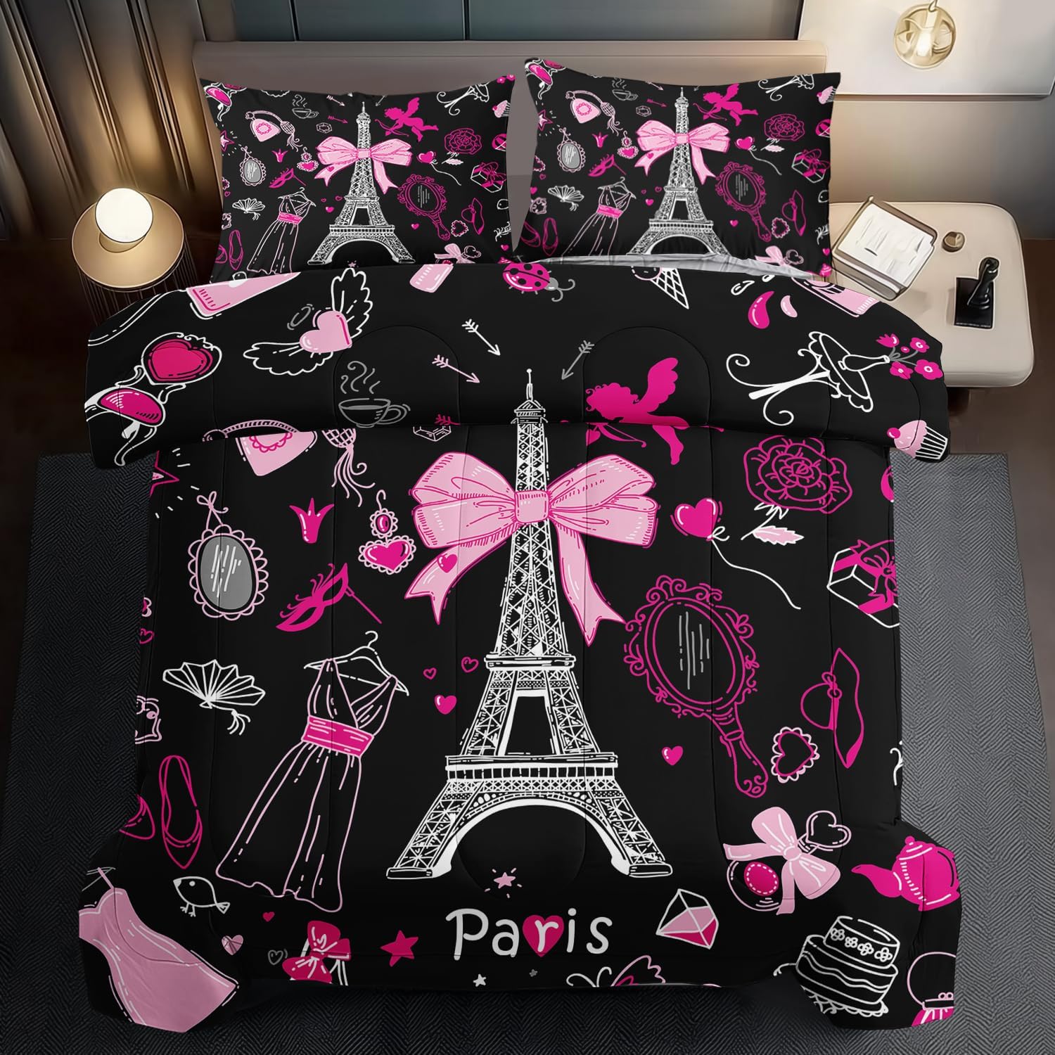 Eiffel Tower Comforter Set Queen Size,Eiffel Tower Bedding Set for Girls, Pink and Black Paris Themed Comforter Bedroom Decor,Paris Quilt French Style Romantic Bedding