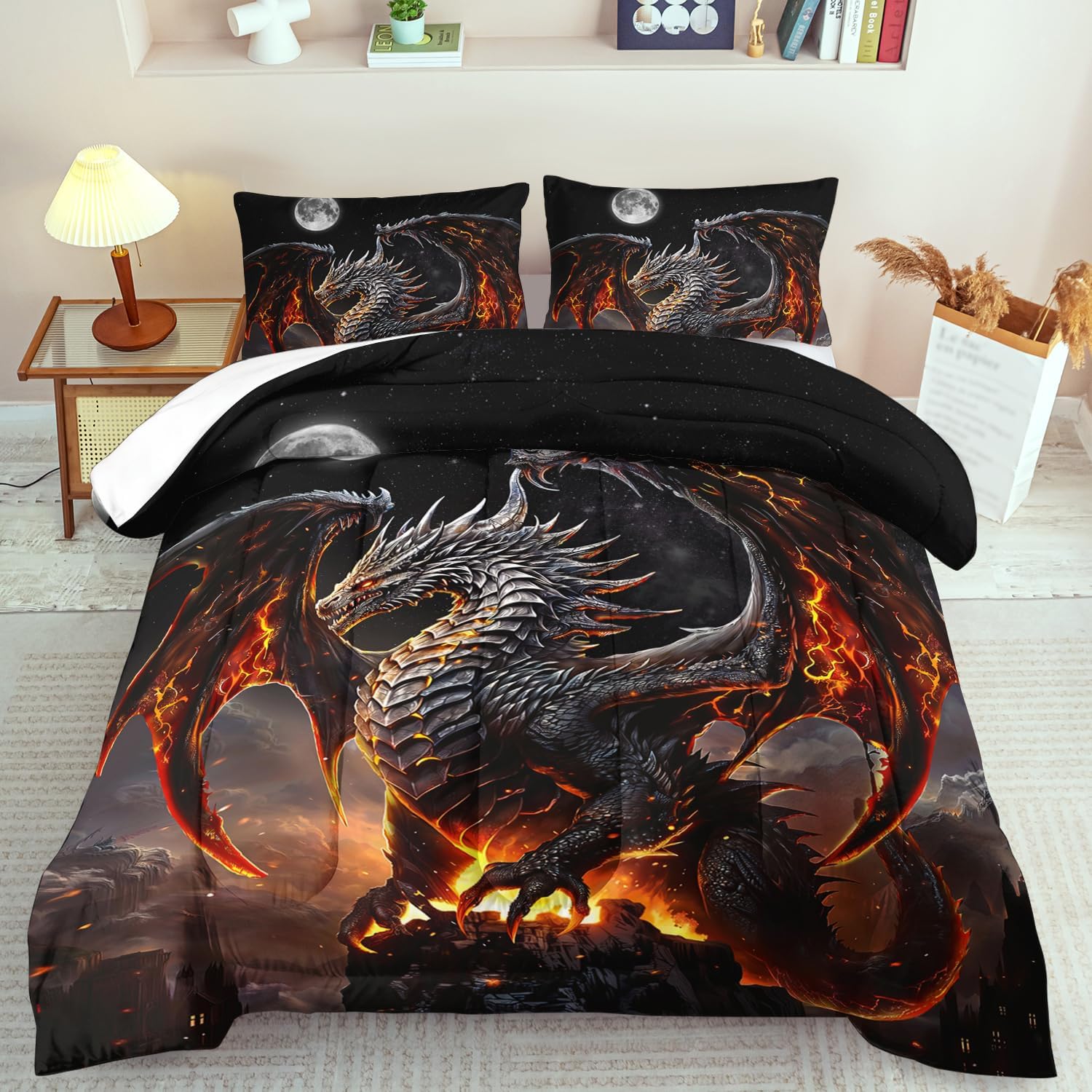 - Queen Size Flame Dragon Comforter Set :This bedding set includes 1 comforter(67" x 85") and 2 pillowcases(20”x30”). In order to facilitate transportation, the quilt is made of vacuum compression technology. It will be slightly wrinkled when taken apart, but it will quickly regain its fluffiness if you gently beat it.