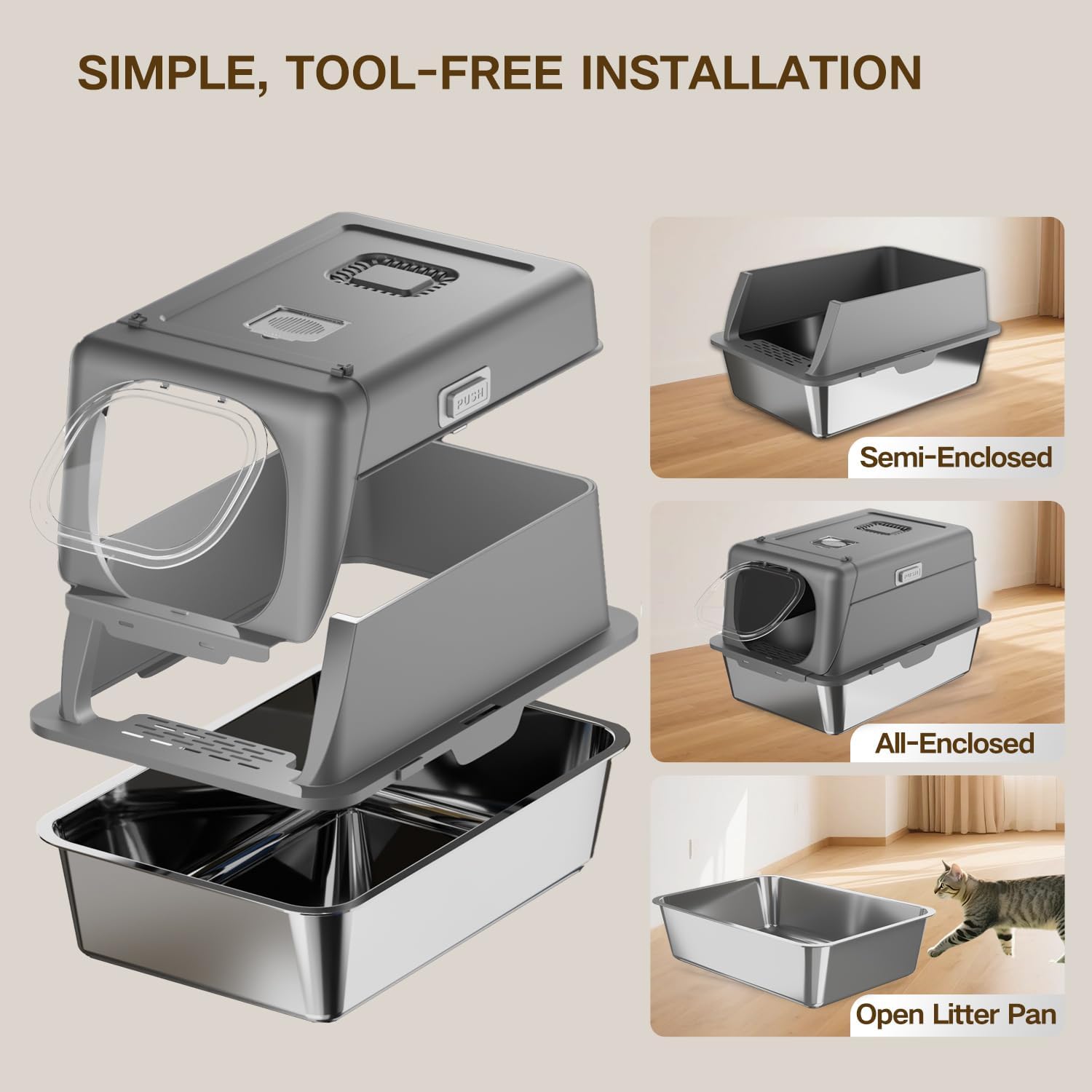 - Premium Stainless Steel Construction – Scratch-resistant and non-stick for effortless cleaning, offering superior durability and hygiene compared to traditional plastic litter boxes.